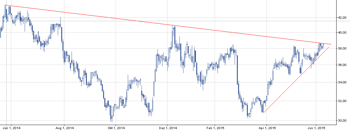 Przykładowe zagranie nad wczorajszym zamnięciem. Wsparcie tworzą przyspieszona linia trendu wzrostowego oraz poziomy 37, 36 czy 35 zł. Udane wybicie powinno wstępnie doprowadzić kurs do poziomu ostatniego szczytu, czyli 41 zł.