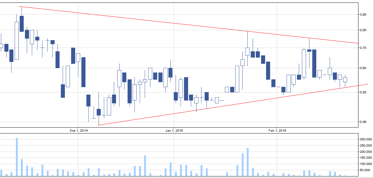 Trend boczny, a obecnie kurs znajduje się na dolnym ograniczeniu linii wzrostowej. Odbicie wewnątrz trójkąta powinno poprowadzić kurs do ok. 70 gr. Walor jest jednak ostatnio mało płynny (3000 zł), więc spółka bardziej do obserwacji, niż do inwestycji. W przeszłości dochodziło jednak do ciekawych wybić na odpowiednim wolumenie, co dobrze rokuje na ew. wyjście ze spółki.