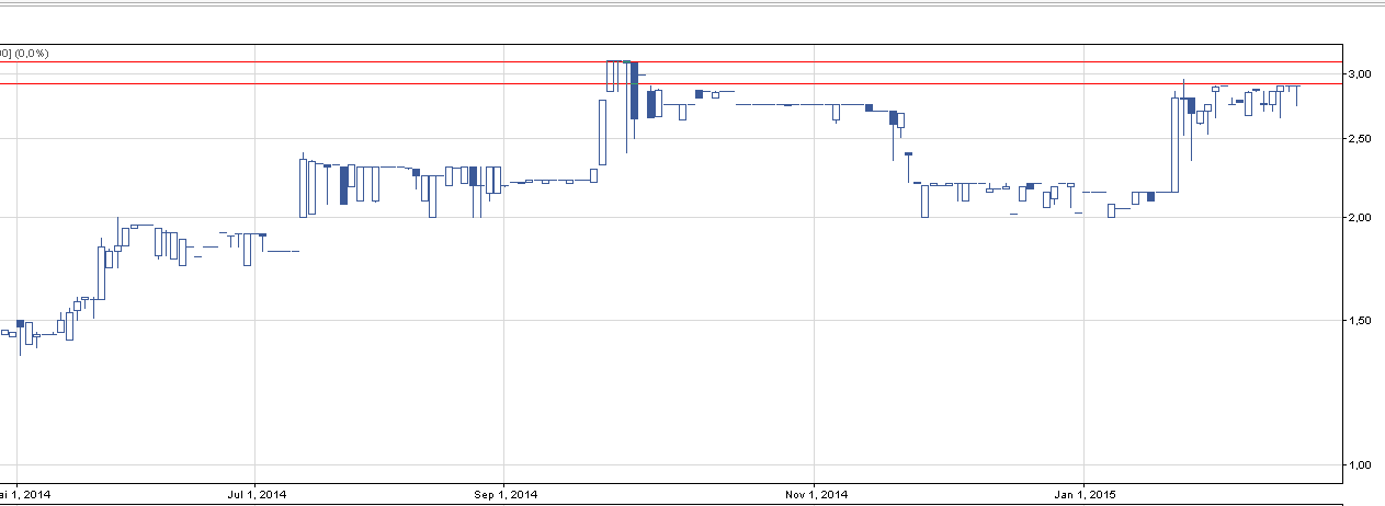Na pierwszy rzut oka mało ciekawy wykres, a i w sprawie płynności spółka podobna jest do poprzedniej. Na plus przemawiają jednak lekki, ale konsekwentny trend wzrostowy, ciekawy raport za IV. kwartał (uwzględniając poprawiony raport, a na temat raportu z błędami odsyłam do artykułu na Interii). Ostatnio dochodzi również do ciekawej konsolidacji na poziomie 2,9 zł. Są to rejony lokalnego maksimum, które powstało na skutek informacji, jakoże Mlb współpracować będzie z Microsoftem. Zatem 2,9, a najpóźniej 3,1, to kluczowe poziomy dla spółki.