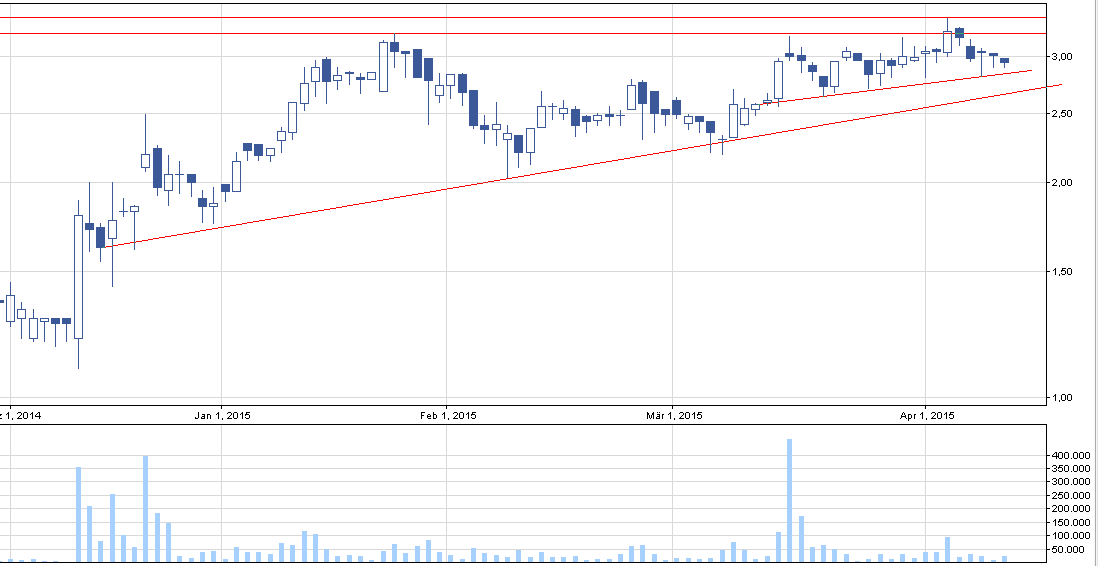 Wykres pokazuje, że kurs ponownie będzie się musiał zmierzyć z oporem, ale tym razem na poziomie 3,4 zł. Lekka luka spadkowa 9.04 nie powstała na tak mocnym wolumenie, aby mogła zagrozić głównemu trendowi. Póki co sekwencja wyższych dołków i szczytów jest zachowana, ale widoczne są relatywnie długie cienie, które testują linię trendu.