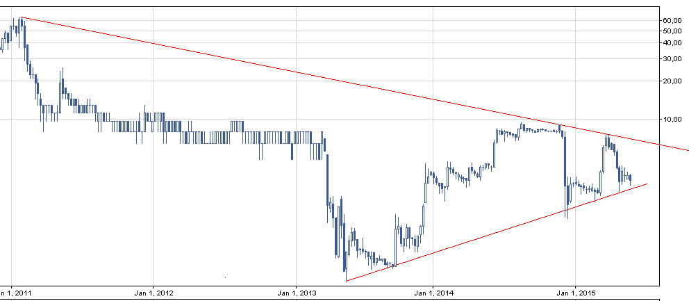 Widoczna jest walka na obu frontach: 3-letni trend wzrostowy vs 2-letni trend spadkowy co w efekcie końcowym daje trend boczny, widoczny również na oddalonym wykresie poniżej.