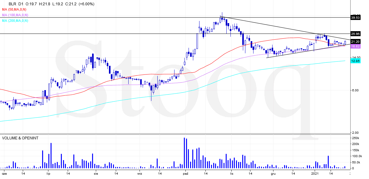 Spółka znajduje się w trendzie wzrostowym. W dniu 26.10.2020 r. kurs ustanowił historyczny szczyt na poziomie 45 zł, od tamtej pory kurs rozpoczął ruch korekcyjny. Na wykresie wyrysowano linię korekty, która była przez kurs kilkukrotnie testowana. Natomiast od dołu kurs jest wspierany przez wyznaczoną krótkoterminową linię trendu. Przestrzeń do kontynuacji ruchu korekcyjnego jest coraz mniejsza, dlatego w najbliższym czasie możliwe jest wybicie kursu w którąś ze stron. Moim zdaniem kurs przygotowuje się do wybicia górą. Najbliższe lokalne wsparcie znajduje się przy krótkoterminowej linii trendu wzrostowego. Pierwszy poziom oporu zaznaczyłem w okolicach 26 zł a następnie poziom 40 zł. Zagrywamy na wybicie górą.