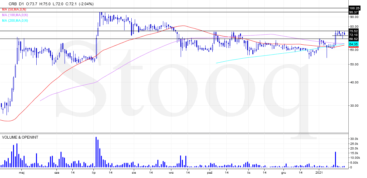 Spółka znajduje się w trendzie wzrostowym. Kurs w lipcu zeszłego roku osiągnął historyczny szczyt w okolicach 95 zł. Od tamtej pory widoczny jest ruch boczny konsolidacyjny pod wyznaczonym oporem w okolicach 75,5 zł. Kilka sesji temu została utworzona mocna świeca popytowa na największym wolumenie od początku konsolidacji. Aktualnie występuje mała konsolidacja pod wyznaczonym oporem. Przebicie tego oporu otworzy drogę dla dalszych wzrostów w kierunku historycznego szczytu. Wsparcie możemy wyznaczyć w okolicach połowy świecy wzrostowej z 18.01.2021 r. a po wybiciu i realizacji pozytywnego scenariusza takim wsparciem powinien być poziom 75,5 zł. Zagrywamy na wybicie górą.