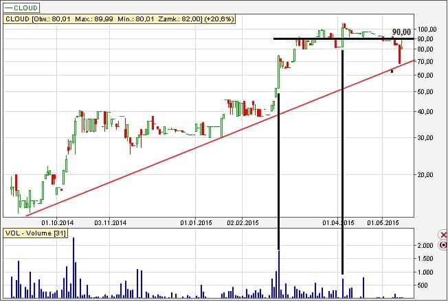 jedna z nielicznych spółek z New Connect w długoterminowym trendzie wzrostowym (od początku zaistnienia na NC). Ostatnio kurs poszybował w okolice wsparcia definiowanego przez linię trendu. Zagrawamy powyżej dzisiejszej świecy 90,00 zł. Przykładowy LimAkt to 90,11 zł.
