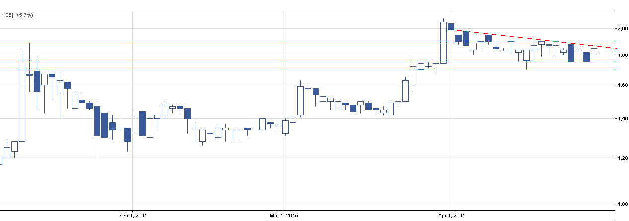 Widać na wykresie wsparcie na poziomie 1,7-1,76, które testowane było na ostatnich sesjach coraz częściej. Opór to 1,9, gdzie widoczne są cztery świecki, które próbowały przeforsować poziom. Możliwe jest także zagrywanie pod wybicie z zniżkującej linii poczętej w okolicach luki cenowej z początku kwietnia. Wszystko może ładnie i pięknie, ale czwartkowy obrót wynosił ledwo 2400 zł… co pozwoliłoby na wejście może jednemu graczowi :)