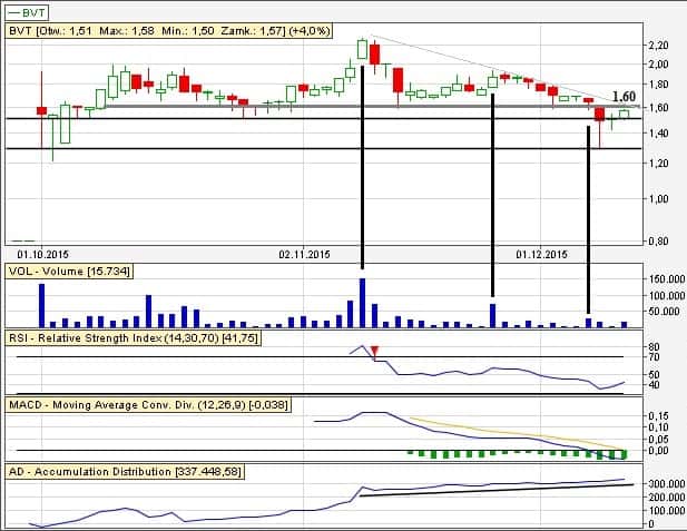 Zagrywka: zagrywamy tutaj pod przebicie oporu 1,60 zł i pod fałszywe wybicie z trójkąta dołem (patrz wolumen).