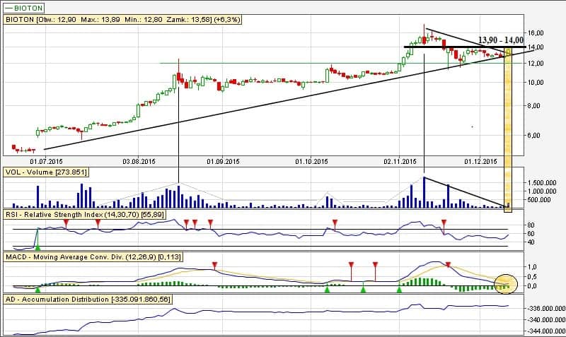 Komentarz: tutaj podobna sytuacja do powyższej spółki. Również wolumen układa nam się pro-wzrostowo. Dzisiaj nastąpiło mniejsze wybicie. Podczas najbliższych sesji oczekuję przebicie 14,00 zł i dalszego, mocniejszego wybicia. Pozytywu również dodaje wskaźnik MACD, który od tych rejonów już się w historii odbijał (nie wspominając o tradycyjnym sygnale kupna przy przecięciu się liń).