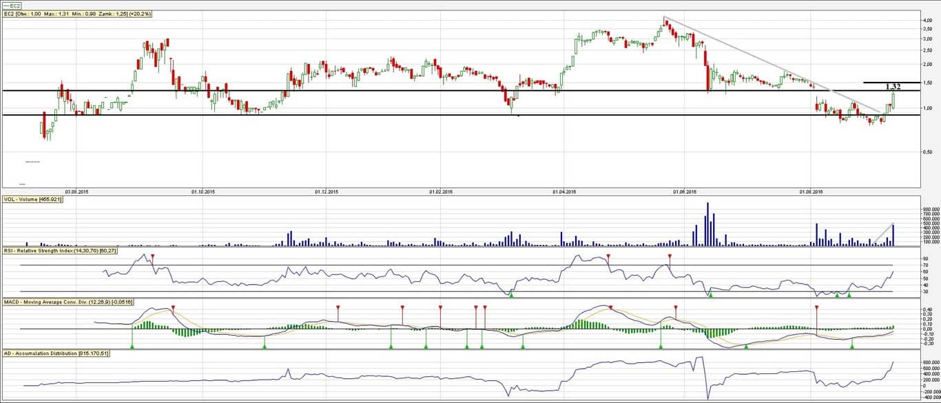 W poprzednim wpisie opisywaliśmy dość obszernie sytuację na EC2. Pisaliśmy, że Free Float wynosi 100% i jest to dobry kąsek dla siły spekulanckiej. Oliwy dolał raport, który informował o kupnie akcji przez nowego Prezesa o wartości łącznej ~30 tyś zł. Takie informacje – szczególnie na takich spółkach – robią swoje. Można więc było śmiało się dołączyć – pisaliśmy, że kurs może dojść do rejonów ~1,15 zł. Ostatecznie sesja zakończyła się na 1,25 zł.