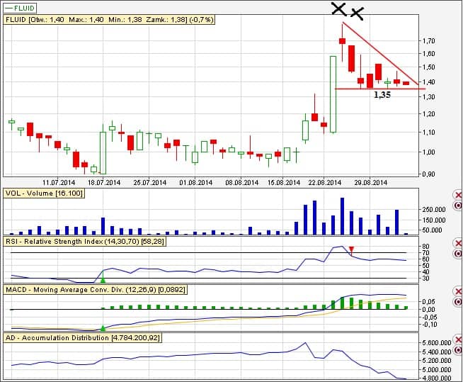 Na razie idzie wszystko na Fluid po naszej myśli. Trochę było do zarobienia. Teraz znowu świeczki mówią o możliwości sporego wybicia. Powinno nastąpić po przebiciu górnej linii narysowanej na wykresie. Potwierdzeniem będzie przebicie lokalnego oporu (świeczki) na poziomie 1,48 ew. 1,54 zł. Tutaj bym się doszukiwał sygnału kupna. Co mnie niepokoi to dwie narysowane świeczki. Patrząc na dłuższą perspektywę czasową widać tam bardzo mocny opór i kurs “odbił” się od niego. Na moc oporu wskazuje również dość spory wolumen w tym czasie.