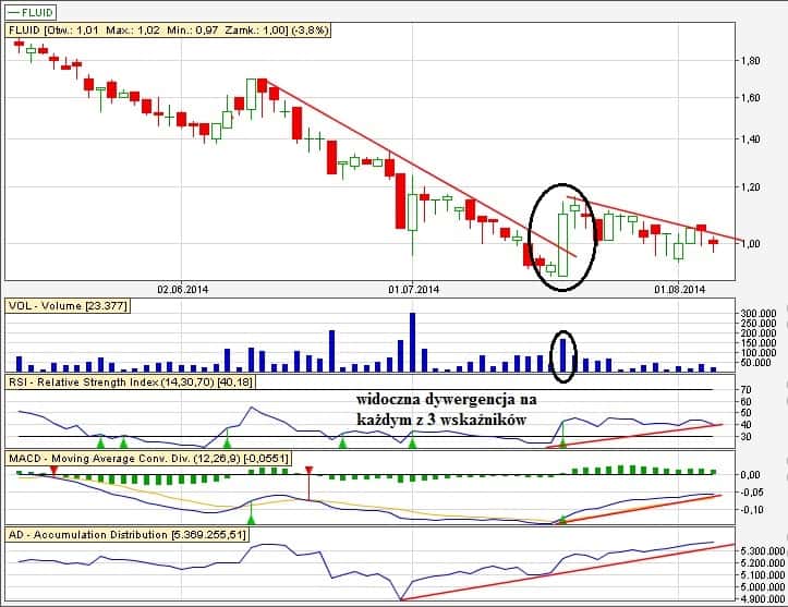 Na wykresie dziennym wyraźnie widać dywergencje na wszystkich trzech wskaźnikach. Dywergencja to w skrócie rozbieżność między wyznaczoną linią dwóch minimów wykresu ceny a liniami linią wskaźnika. Linie MACD znajdują się wyraźnie poniżej poziomu zero (mamy więc do czynienia z mocnym wyprzedaniem rynku) i zaczynają rosnąć, wyprzedzając jednocześnie ceny. Jest to mocny sygnał informujący o potencjalnej zmianie trendu krótkoterminowego na wzrostowy. Potrzebujemy jednak potwierdzenia na przykład w formie przebicia jakiegoś ważnego oporu, między innymi 1,17 zł. Można również zagrać na przebicie linii spadkowej i przełamanie lokalnego oporu 1,07 zł.