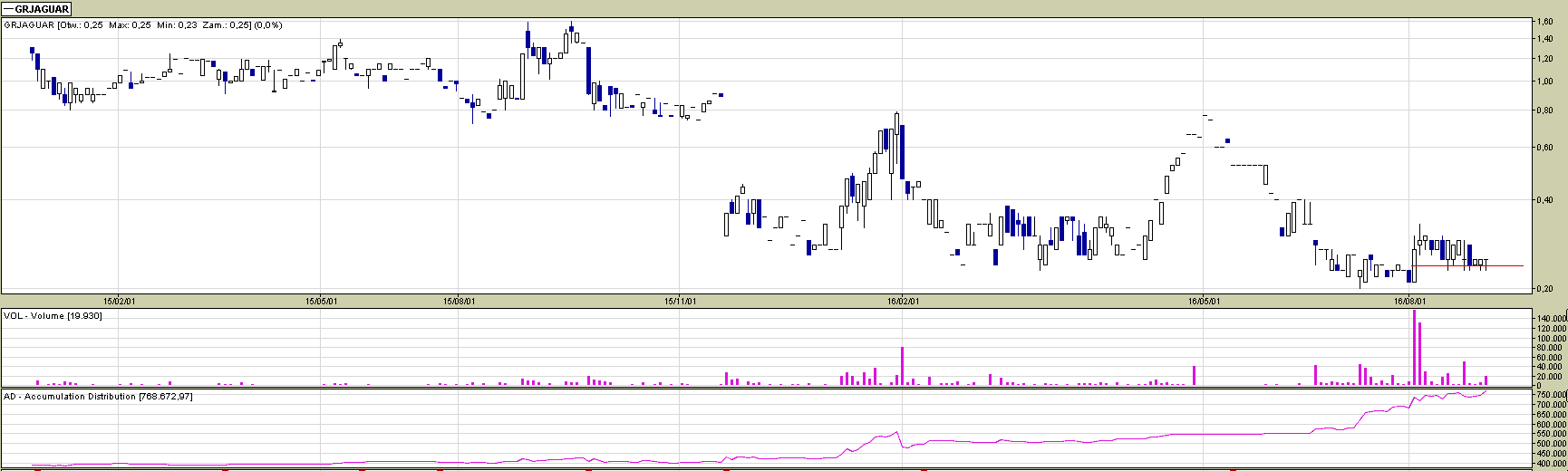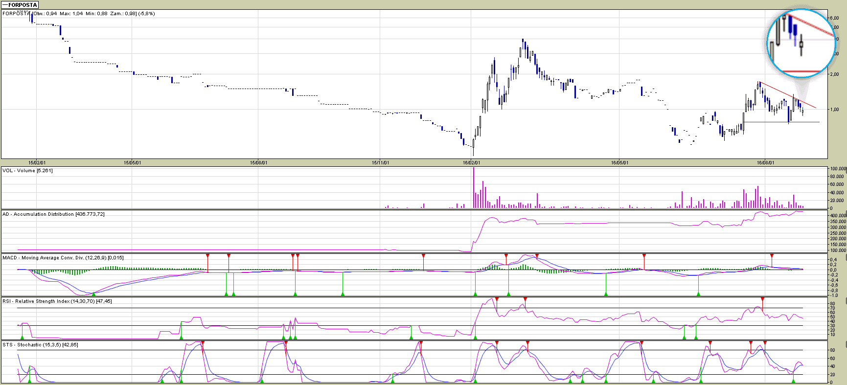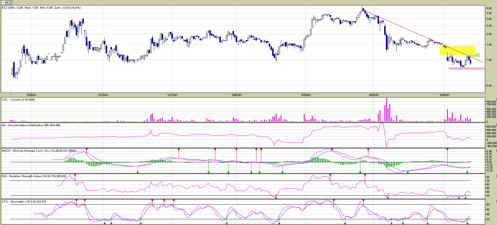 Mocny trend spadkowy w średnim terminie, który nastąpił po doczołganiu się do historycznych maksimów. Zauważalna jest siła podaży (wolumen + zniżkujące AD) w drugiej połowie czerwca br. Pozycja spekulacyjna, ale z prowzrostowymi wskaźnikami:zagranie na przebicie 1,1x zł. Ewentualnie można łapać akcje przy obecnym poziomie (~0,90gr), ale wtedy konieczny jest SL przy czerwonej linii, która wskazuje lokalny dołek (~0,80 zł).