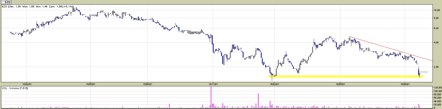 Kolejny arcyspekulacyjny typ, to EZO. Kurs po wybiciu z formacji podwójnego dna i osiągnięciu odpowiedniego poziomu, rozpoczął powolny spacer na południe, aby finalnie runąć w dół w okolice minimów. Jedyna pozytywna ciekawostka, to potencjalny młot, który potrzebuje potwierdzenia w postaci dużej białej świecy. Zdecydowani na papier powinni pamiętać o SL pod dolnym knotem ostatniej świeczki (~1,44 zł).