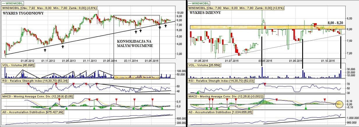 Komentarz: mniej więcej analogiczna sytuacja do Windmobil; trend wzrostowy potwierdzony przez prawidłowy ruch wolumenu; zbliżający się sygnał kupna na wskaźniku MACD oraz olbrzymi wolumen na ostatniej sesji