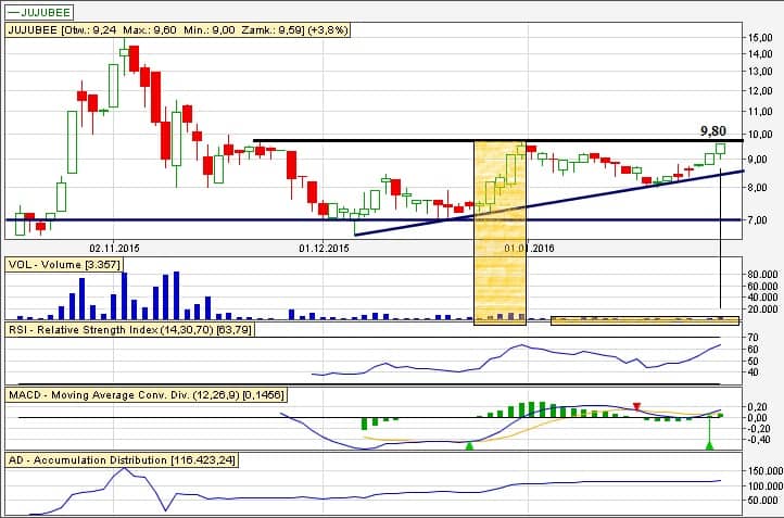 Na Jujubee ostatni raz zagrywaliśmy 22 grudnia z zarejestrowanymi użytkownikami. Stopa wzrotu +26,01% (od przykładowego LimAkt 7,61). Również informowaliśmy , że jest opór między 9,50-10,00 zł. Aktualnie właśnie znowu do niego docieramy. Zagrywamy pod potencjalne wybicie z tego al’a trójkąta zwyżkującego pod przebicie 9,80 zł.