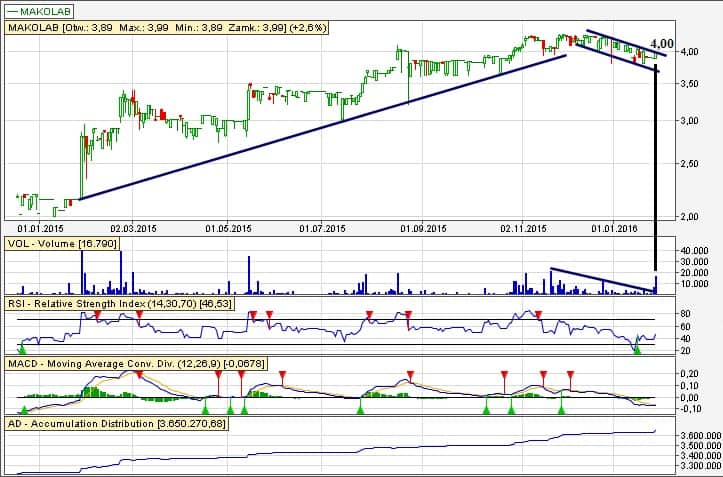 Makolab to walor w długoterminowym trendzie wzrostowym (od ~6 lat). Aktualnie widoczna korekta w postaci formacji technicznej flagi. Zagrywamy pod potencjalne wybicie z tej formacji po przebiciu 4,00 zł.