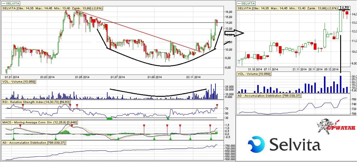 Jak już pisałem w temacie: tworzy nam się potencjalny spodek. Potwierdza to również wolumen. Ostatnia długa, wzrostowa świeca (wykres przybliżony po prawej) daje bardzo pozytywny wydźwięk. Będę prawdopodobnie sam zagrywać pod wybicie z górnych ceni ostatnich świec, a więc lekko powyżej 14,50 zł. Patrząc na historię wykresu do wybicia nie dojdzie zapewne jeszcze w tym tygodniu, jednak myślę, że niedługo powinno to natąpić. Jeżeli szybciej przekroczymy cenę, to tym lepiej. Na 16 zł jest jednak dość mocny opór, więc osobiście bym brał 4-10% i uciekał przed potencjalną korektą. Dopiero po przebiciu 16-16,35 zł ponownie zagrywał.
