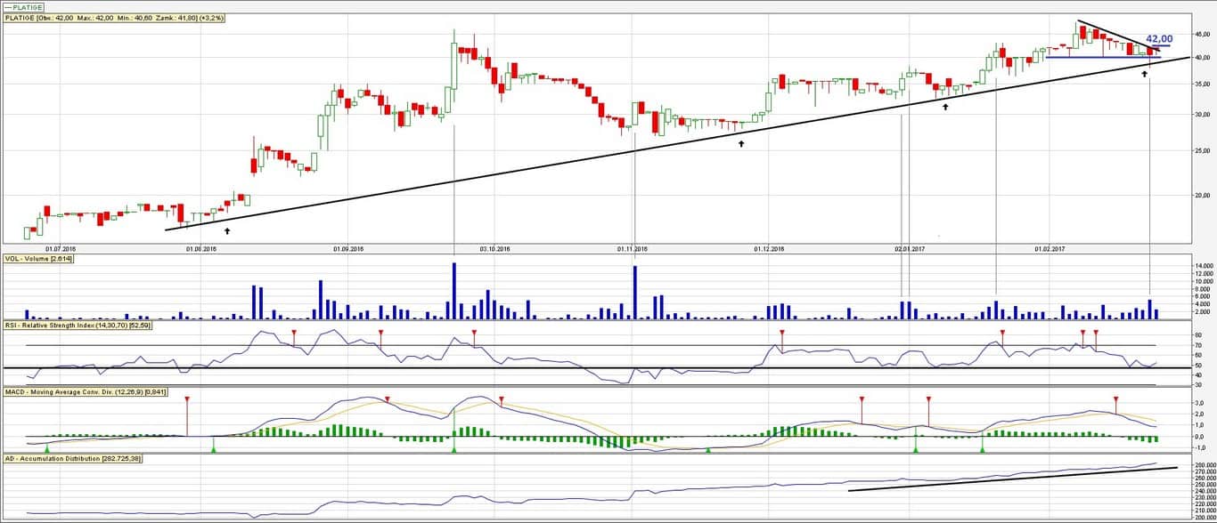 Kurs właśnie dotarł bezpośrednio do linii trendu wzrostowego. Ponadto tworzy się formacja al’a trójkąta zniżkującego (nie jest poparty wolumenem). Zagrywamy więc pod dalsze odbicie się od wsparcia oraz pod potencjalne wybicie z al’a trójkąta – pod przebicie 42,00 zł.