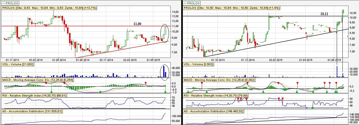 Od dwóch tygodni na kursie spółki Prolog tworzy się największy historyczny wolumen. Bardzo negatywne świece utworzone w czerwcu zeszłego roku (poziom 10-11 zł) zostały więc zanegowane. Dość silny rejon oporu 10,11 zł został przebity. Patrząc na ostatnią konstelację świec uważamy, że kolejny opór na poziomie 11,00 zł (patrz wykres tygodniowy) powinien również zostać przełamany. Argumentem za takim scenariuszem jest utworzenie się na wykresie świecowym formacji trzech białych żolnierzy. Tworzy się ona na końcu trendu spadkowego/korekty. Taką korektę mieliśmy na walorze od lutego do czerwca tego roku.