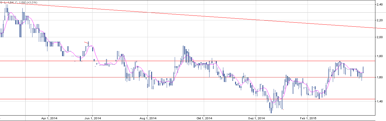 Zremb, to spółka, która toczy quasi wewnętrzną walkę z dwoma trendami: długoterminowym spadkowym oraz krótkoterminowo wzrostowym. Ciekawie układają się ostatnio świeczki pod wybicie, które dobijając do pewnego wsparcia stosunkowo szybko się od niego odbijają. Do takiego odbicia doszło także dzisiaj, co pozwala myśleć, że kurs na najbliższych sesjach mierzyć się będzie z najbliższym oporem Potencjalny zasięg wzrostów to nawet ograniczenie wynikające z linii trendu spadkowego, a to na obecną chwilę rejon 2 zł, przy obecnej wycenie kursu 1,69 zł. Przedtem kurs zmierzyć się będzie musiał z ostatnim szczytem na poziomie 1,9 zł. Możliwe wzrosty grane mogą być również pod informację, która ukazała się w poniedziałek rano o zawarciu znaczącej umowy o wartości 7,8 mln zł. Obrót na spółce to niecałe 40 tys. zł, należy o tym pamiętać rozważając wejście w spółkę.