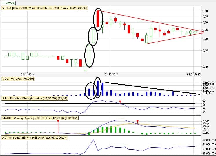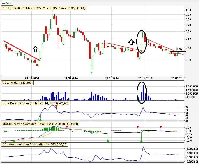 Dzisiaj dzień spółek bardzo spekulacyjnych. Jedna spółka w upadłości likwidacyjnej, druga spółka z New Connect. Pierwsza bez prezesa (złożył rezygnację dwa dni temu), w drugiej się szykuje dość pokaźny minus zysku za rok 2014 (jednak związany pośrednio z inwestycjami). No i obie to groszówki i w trendach spadkowych. Myślę, że wystarczy tych superlatyw? Ale nawet i na takich spółkach można czasem nieźle zagrać. Bierzcie jednak pod uwagę stopień ryzyka: większego ryzyka chyba nie znajdziecie na innych spółkach. O ile Vedia pewnie jeszcze się wyliże, to DSS jest w upadłości likwidacyjnej.
