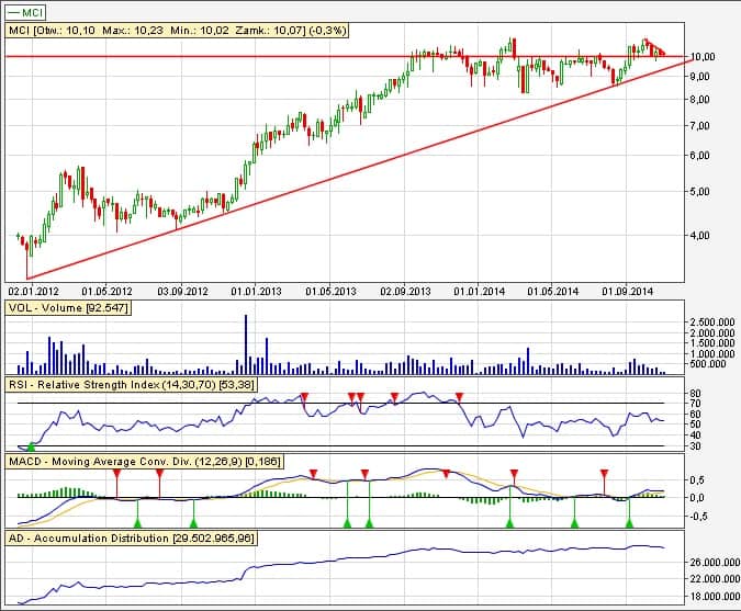 Na wykresie tygodniowym wyraźny jest ładny, długoterminowy trend wzrostowy. Podobna sytuacja znajduje się na wykresie tygodniowym MCI: