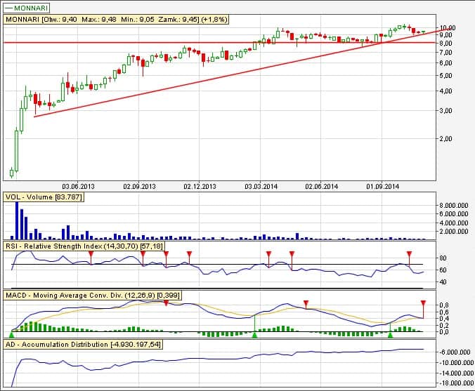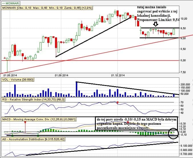 No spółka porządnie wygląda pod względem analizy technicznej. Ładny, długi trend wzrostowy przy którym właśnie się znajdujemy. MACD daje (patrząc na historyczny przebieg) sygnał zakupu + przecięcie się liń/przecięcie punktu 0. Wskaźnik AD również wskazuje na akumulację. No i podwyższony wolumen przy świecy z 30.10.14 i przy tym podwyższony wolumen przy dojściu do linii trendu. Wskazuje to na potencjalną akceptację ceny przy tym punkcie. AT mówi jednoznacznie, że dalsze wzrosty są bardzo prawdopodobne. Spółkę przeanalizuję dokładniej i pomyślę, czy samemu nie wejść drobnym kapitałem.