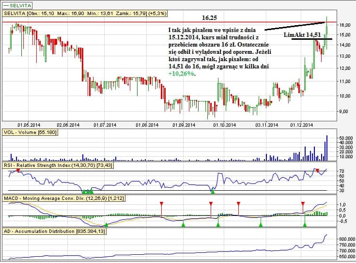 Ponownie bym zagrywał po stałym przebiciu obszaru 16,00-16,35 zł. Ostatnio się tworzy ładny wolumen, więc pozytywnie świadczy o walorze. Również trzeba wspomnieć, że od piątku Selvita jest notowana na WIG, a nie jak to miało miejsce do tej pory na New Connect. Długoterminowo dobrze wygląda: odwołuję do poprzedniego wpisu (analiza techniczna Selvita 15.12.2014).