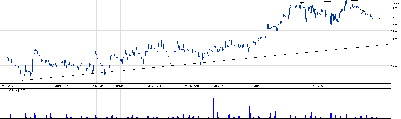 Walor porusza się długoterminowo w trendzie wzrostowym, aczkolwiek krótkoterminowo mamy do czynienia z trendem spadkowym. Obrót jest niski, bo wynosi ok. 9000 zł przy zaledwie 7 transakcjach. Na wskaźniku AD widzimy zdecydowaną akumulację, a MACD jest bliski wygenerowania sygnału kupna. Interesująco wygląda również SMA200, które działa na tę chwilę jako długoterminowy wyznacznik wsparcia. Mocne wahania na wykresie nie należą do rzadkości, ale na tę chwilę liczę na obronę 7 zł, który jest zarazem ceną przykładowego kupna.