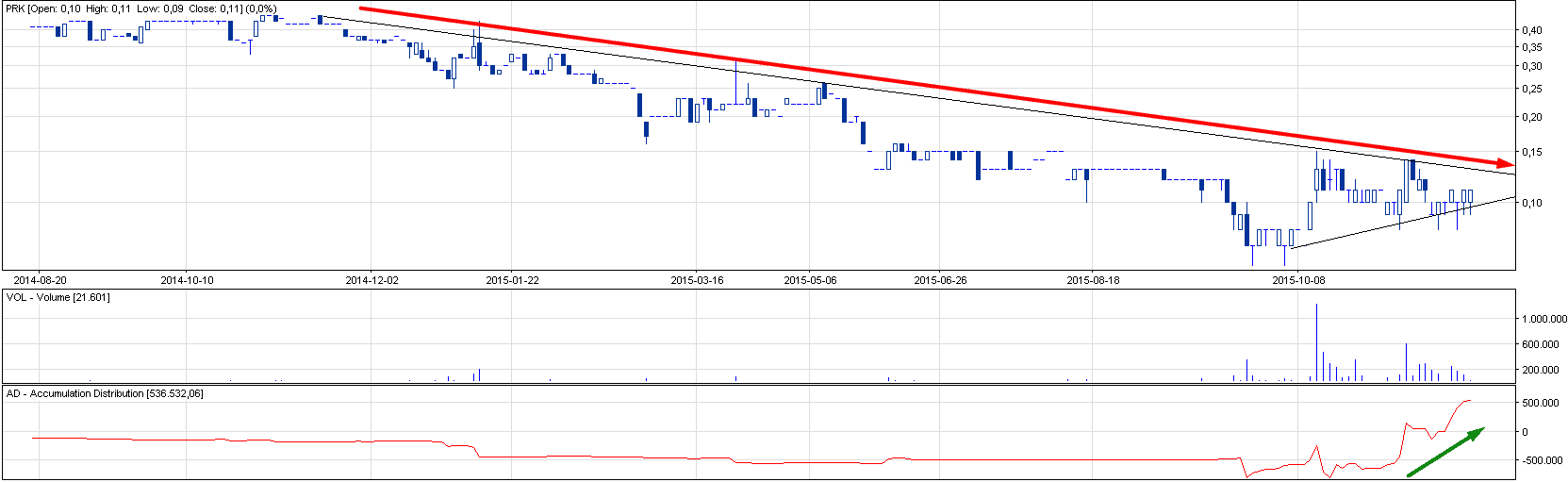Produkty Klasztorne (PRK) to spółka z trendem długoterminowo spadkowym, ale pozytywną dywergencją na wskaźniku AD i pokrewne. Sposób zagrania dwojaki: a) spekulacyjny, czyli na utrzymanie dolnej “linii trendu wzrostowego” bądź b) bezpieczny, czyli pod wybicie z trendu z LimAkt na 16 gr. Pierwsze poważniejsze wsparcie widać na 8 gr, a następnie na 6 gr. Walor podobnie do powyższego również nie grzeszy obrotem.