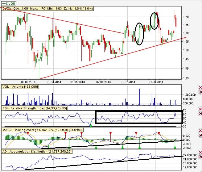 Dwie spore świece przy dużym wolumenie (zaznaczone na wykresie) wskazują na akumulację akcji. Potwierdza to wskaźnik akumulacji/dystrybucji (AD). RSI po jasnej stronie mocy oraz MACD przebijający punkt 0. Jednak nie wchodziłbym jeszcze na jutrzejszej sesji. Jeżeli luka jutro zostanie domknięta, to nic dobrego na następne sesje to nie będzie wróżyło. W dłuższej perspektywie jednak nie powinno to w niczym przeszkodzić. Wtedy będzie okazja do relatywnie taniego zakupu. Jeżeli nie zostanie zamknięta, to pozytywny scenariusz.
