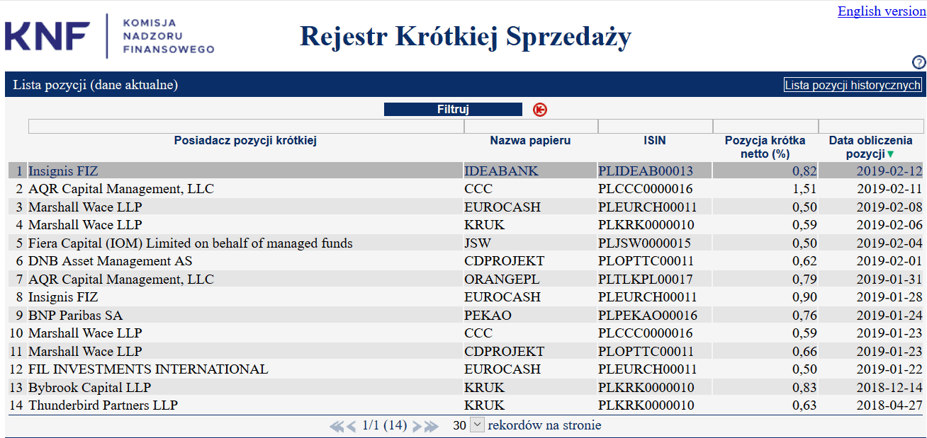 Zanim jednak zaczniemy, chciałbym kolejny raz zwrócić uwagę na ciekawą stronę KNF, która publikuje rejestr krótkich pozycji dokonywanych przez tzw. “grube ryby”. O rejestrze tym pisaliśmy niejednokrotnie, ale warto wspomnieć o nim kolejny raz z uwagi na ostatnio zajmowane tam pozycje: