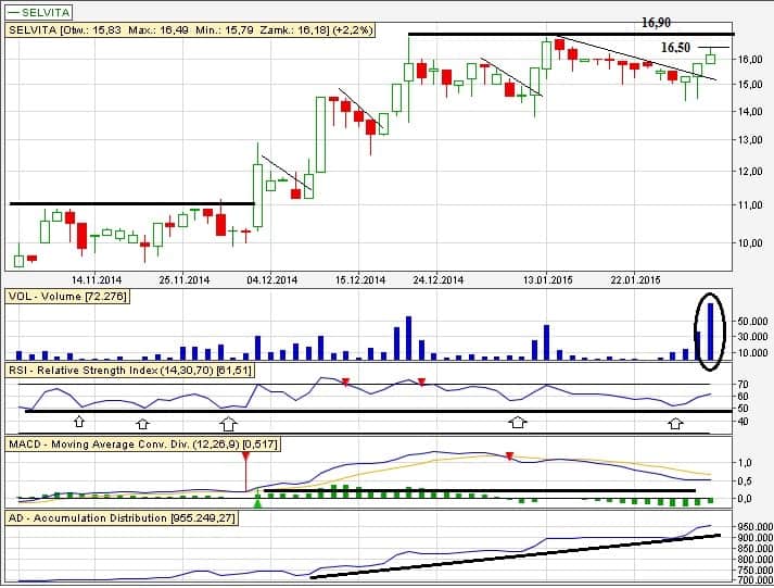 Pierw odsyłam do poprzedniej analizy (analiza techniczna Selvita). Spółka przeniosła się w grudniu z New Connect na główny rynek. Na wykresie w dalszym ciągu panuje długoterminowy trend wzrostowy i pozytywne otoczenie techniczne. Na ostatniej sesji mieliśmy również styczność z jednym z największych dotychczas obrotów na tym walorze, gdzie rysowały się pozytywne bary intradayowe.