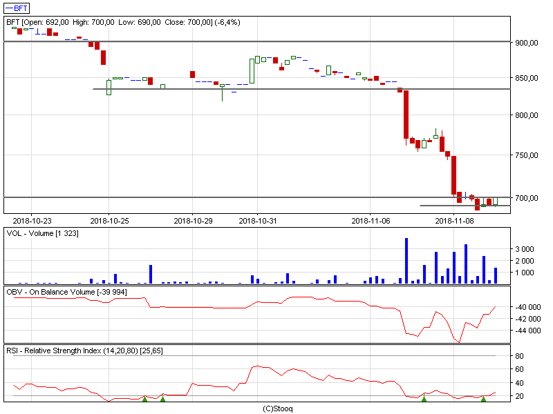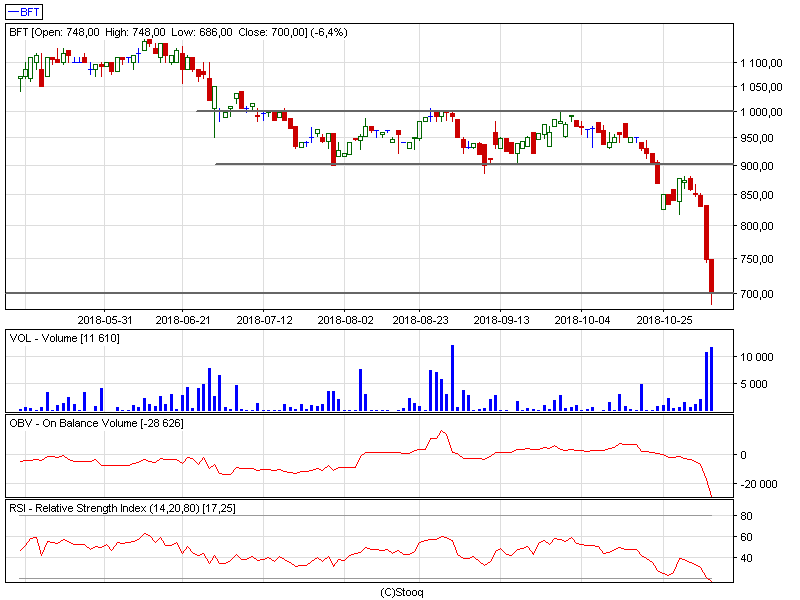 Wykres na interwale tygodniowym pokazuje, że aktualnie kurs znalazł się przy ważnym wsparciu zlokalizowanym na poziomie 700 zł, wcześniej przebijając dołem ważne wsparcie na 900 zł.