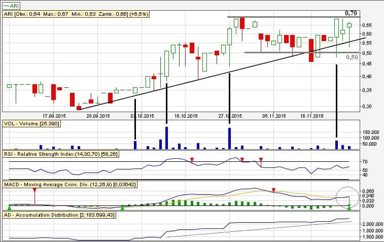 Aktualnie na wykresie mamy do czynienia z trendem wzrostowym (za sprawą ostatnich pozytywnych raportów finansowych). Trend jest notorycznie potwierdzany przez pozytywne świece tworzonych przy sporym wolumenie. Widoczna jest aktualnie mała konsolidacja w obszarze 0,50 – 0,70 zł. Na 0,75 zł znajduje się historyczny szczyt z listopada 2013 roku.