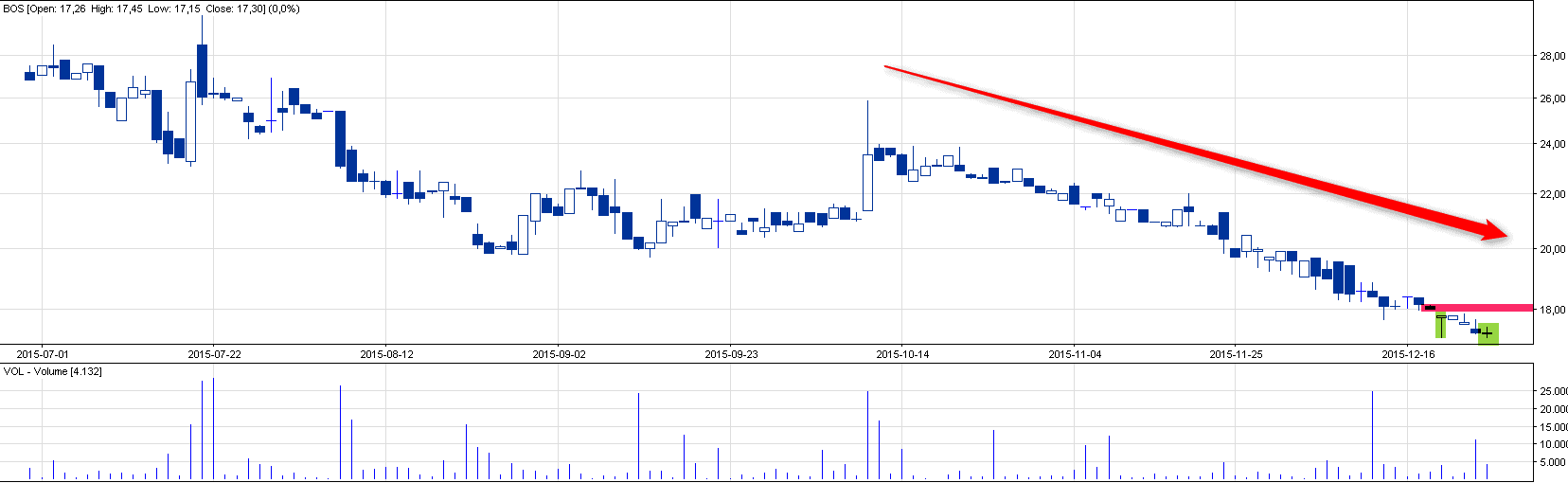 Komentarz: Spółkę analizujemy już kolejny raz, ciągle szukając jakiegoś sygnału, który pozwoli na byczy rajd. Tym razem dopatrzeć się można dwóch sygnałów, które mogą zwiastować jakieś odbicie: zaznaczony na zielono młot oraz gwiazda doji. Kurs ma przed sobą przeszkodę w postacji luki spadkowej, stąd też czekamy na jej domknięcie, aby podjąć atak. Sygnał wejścia może zainicjować także MACD, który znajduje się blisko wygenerowania sygnału kupna.
