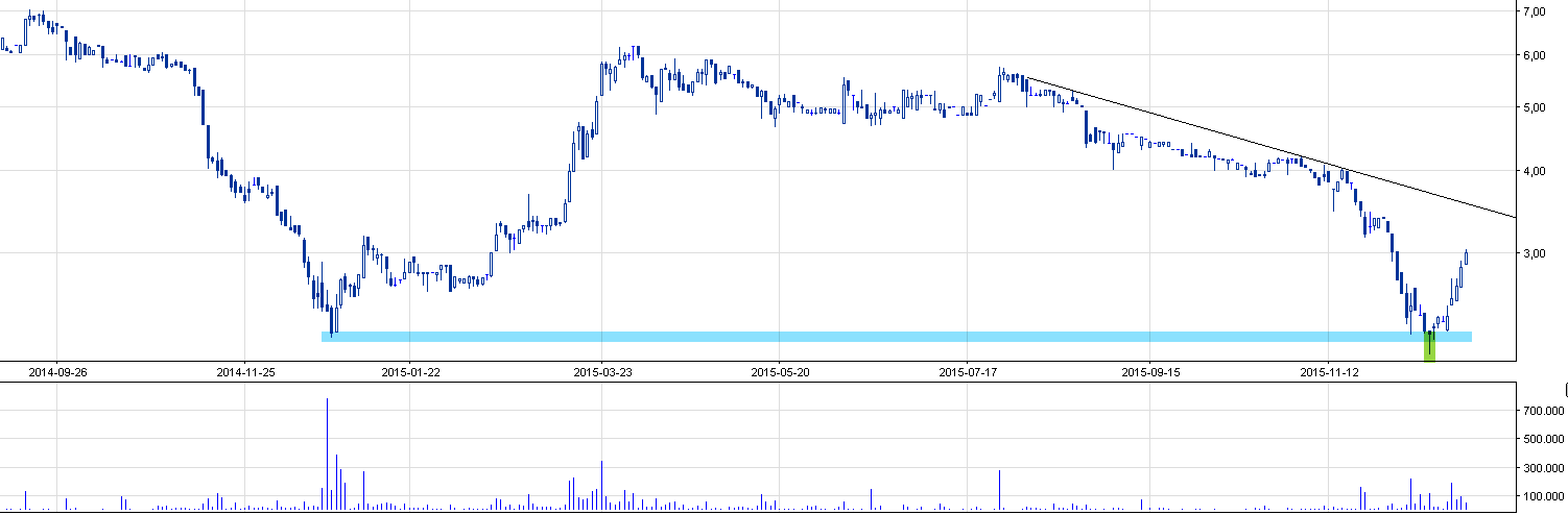 Komentarz: Sytuacja wygląda bardzo prosto: kurs odbił się od dna tworząc przy tym świecę młot, mieliśmy zatem do czynienia ze zdwojonym sygnałem kupna, który jest w trakcie realizacji. Potencjalnie kurs ma szansę dolecieć do ~3,38 zł, gdzie przebiega zniżkująca linia trendu. Scenariusz bardzo optymistyczny zakłada wzrost do najbliższej konsolidacji, która znajduje się na poziomie ~3,9 zł.