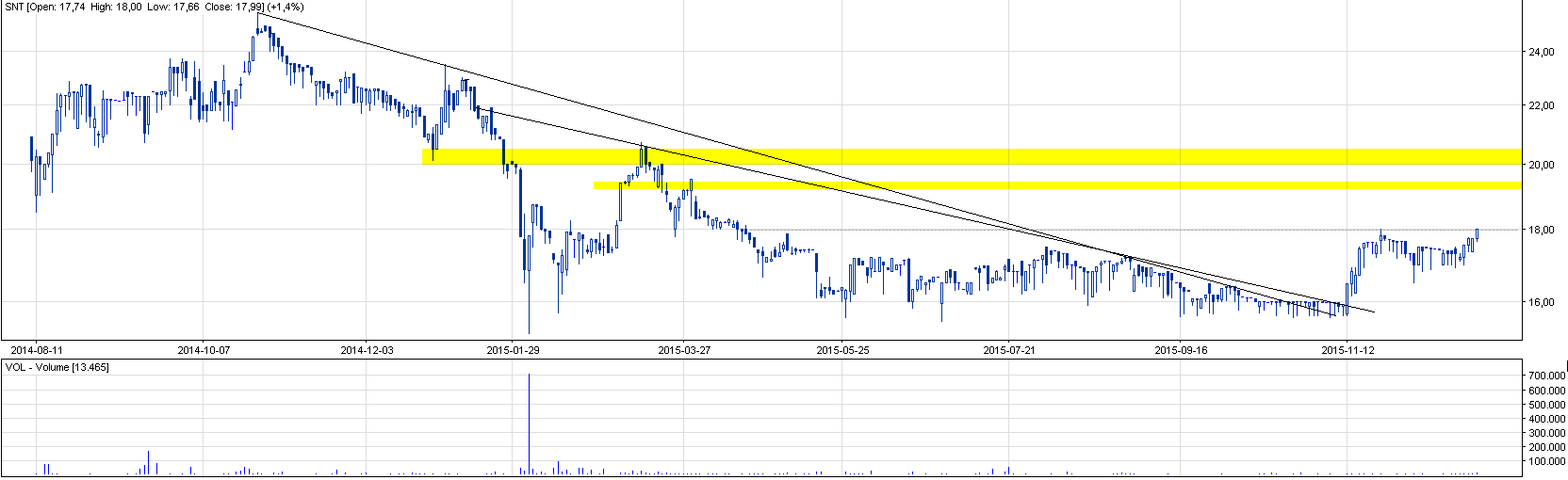 Komentarz: Trend spadkowy spółki ma spore szansę na zmianę o 180 stopni. Dzisiejsze zamkniecię wypada idealnie na lokalnym oporze i brakuje dosłownie paru groszy, aby doszło do kolejnego wybicia. Poprzednie wybicie miało miejsce przy 16 zł, kiedy to doszło do wybicia z trójkąta zniżkującego. MACD dało na ostatniej sesji sygnał kupna, więc szansę na kontynuację wzrostów są niemałe. Potencjalna zwyżka powinna dobić do okolic 19,5 zł (żółty poziom).