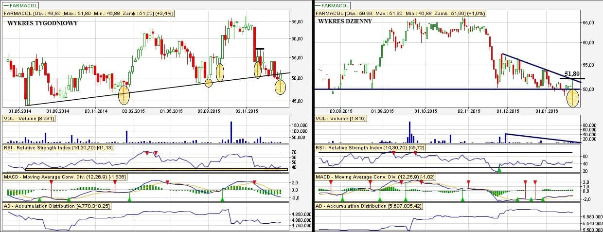 Farmacol to spółka w długoterminowym trendzie wzrostowym (od początku notowań). Na ostatniej sesji mieliśmy do czynienia prawdopodobnie z fałszywym wybiciem z trójkąta zniżkującego. Zagrywamy tutaj pod tę formację oraz pod wybronienie linii trendu wzrostowego (patrz wykres tygodniowy).