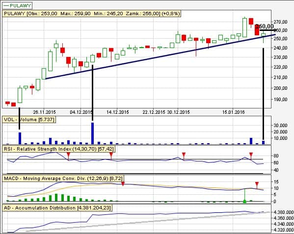 Puławy to kolejny walor w długoterminowym trendzie wzrostowym (od początku notowań). Zagrywamy pod podobny schemat jak wyżej: pod odbicie od linii trendu wzrostowego oraz pod ostatnią świecę/wybronienie wsparcia.