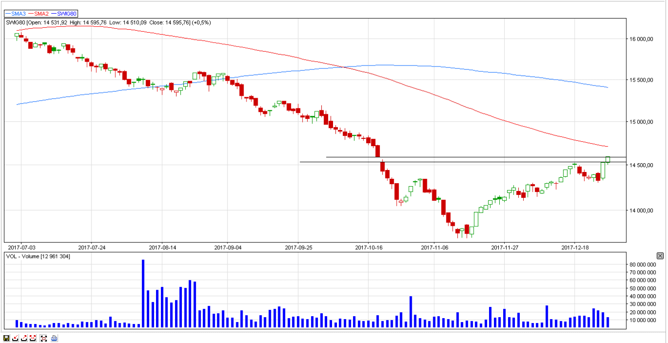 Na wykresie indeksu SWIG80 doszło do domknięcia luki bessy, dlatego bardzo prawdopodobne są dalsze zwyżki tego indeksu.