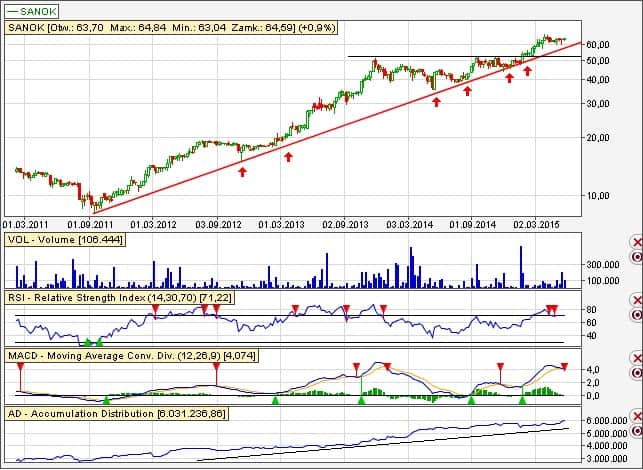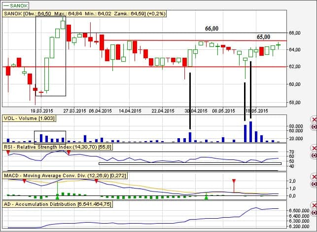 Aktualnie kurs się konsoliduje między 62 – 65,00 zł. Zagrywamy więc z lekkim przyspieszeniem lekko powyżej 65,00 lub już po przebiciu 66,00 zł. Bezpieczniejszym wariantem – gdzie nie tracimy również dużo potencjalnych procentów – jest rzecz jasna druga zagrywka. Układ wolumenu bardzo pozytywny.