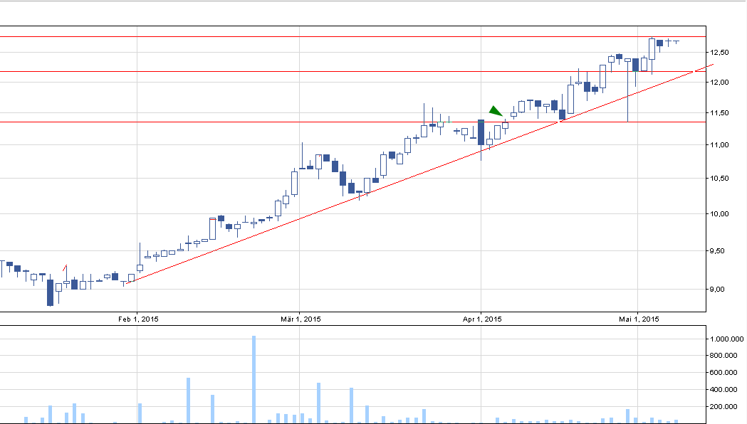Gdzie ustawiłbym się z zakupami? 12,79 wydaje się być ciekawym miejscem do zajęcia pozycji. Jest to miejsce nad ostatnim szczytem kursu. Jeżeli ktoś ma na tyle odwagi, to może próbować szczęscia i łapać akcje nieco niżej czekając, aż grubsi gracze będą chcieli uruchomić parę StopLossów, jak miało to miejsce 29.04 – wtedy przed dalszymi spadkami kursu broniła luka cenowa zaznaczona powyżej.
