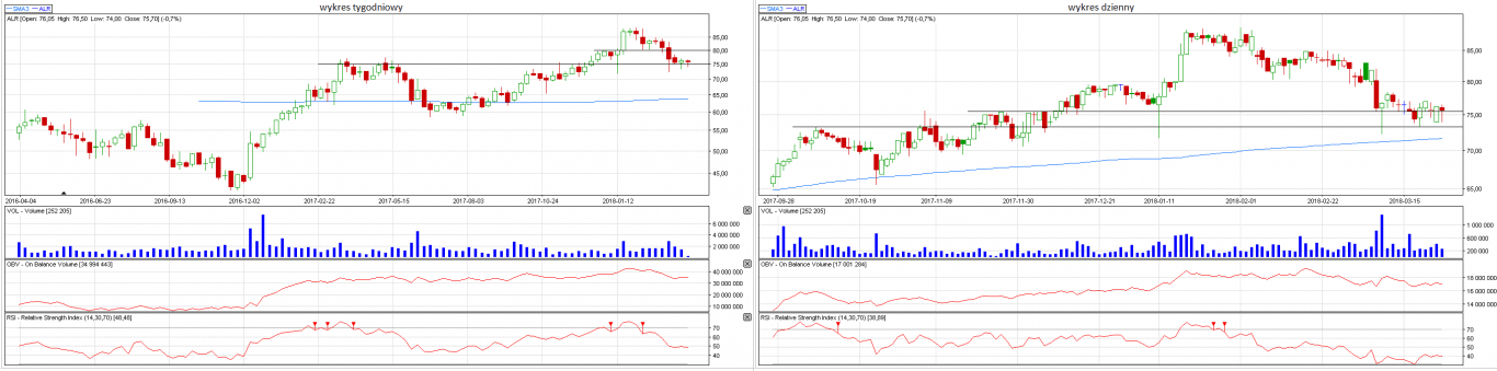 Na wykresie z interwałem tygodniowym widzimy, że spółka znajduje się w długoterminowym trendzie wzrostowym. Aktualnie mamy do czynienia z korektą, gdzie kurs zszedł do obszaru wsparcia (poziom 73,50 – 75,50 zł). Zagrywamy na wybicie kursu z tego obszaru.