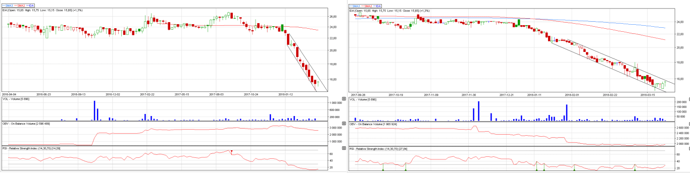 Kurs akcji tego banku od dłuższego czasu ostro spada. Jak możemy zauważyć na załączonym wykresie kurs porusza się w kanale spadkowym. Od kilku sesji kurs się zatrzymał w okolicach 15 zł i zaczęły się pojawiać świeczki popytowe, co jest pierwszym pozytywnym sygnałem. Wskaźnik RSI jest blisko wygenerowania sygnału kupna a wskaźnik OBV wykazuje delikatną akumulację. Zagrywamy na realizację pozytywnego scenariusza, który zakłada, że kurs będzie chciał się wybić górą z tego kanału.