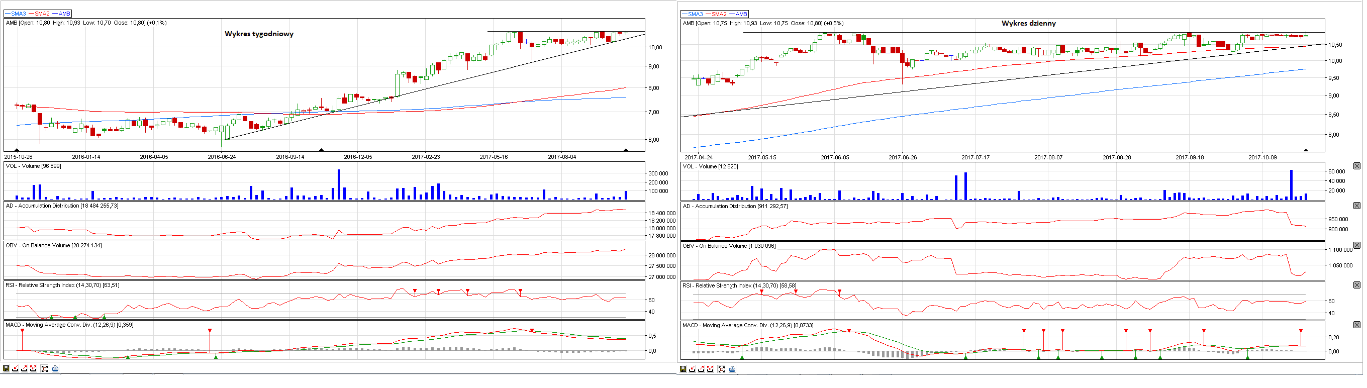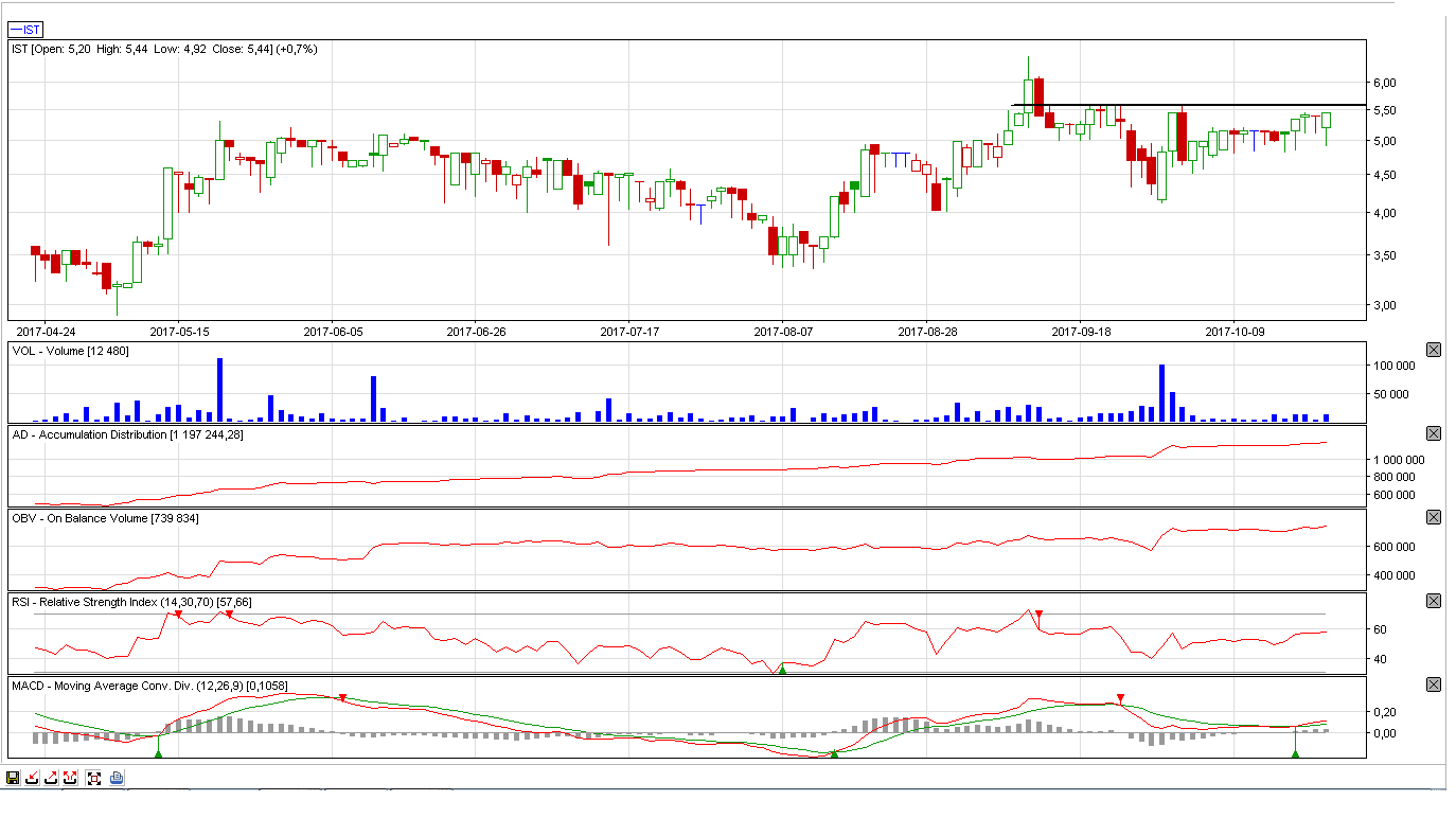 Kurs się akumuluje pod oporem na 5,58-5,59 zł (aktualnie w arkuszu największy opór jest na 5,44 zł) co widać po wskaźniku AD/OBV. Zagrywamy na zakończenie konsolidacji i wybicie oporu.