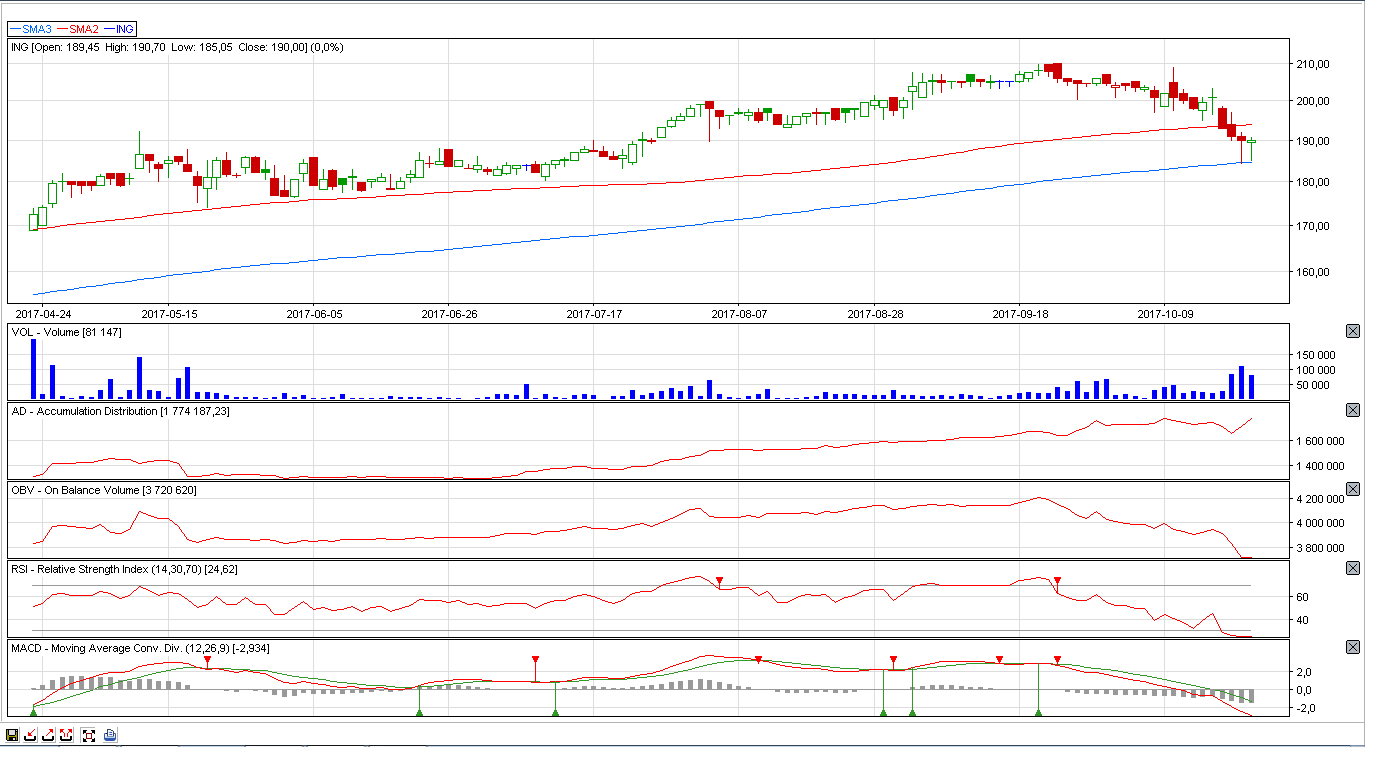 Ciekawa sytuacja jest na wykresie ING, gdzie kurs zszedł poniżej wsparcia w okolicach 190 zł i dotarł do SMA200. W tym momencie pojawił się popyt i bykom udało się podciągnąć kurs do okolic wsparcia. W czwartek i w piątek powstały dwie świece na kształt młotka na zwiększonym wolumenie. Zagrywamy na przebicie piątkowej świecy.