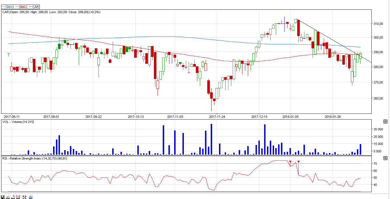 Spółka znajduje się w długoterminowym trendzie wzrostowym. Na wykresie widzimy, że kurs od kilkunastu sesji porusza się w korekcie, a na ostatniej sesji doszło do przebicia wyznaczonej linii korekty. Zagrywamy na przebicie poziomu 290 zł.