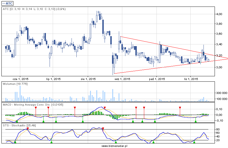 Kupując Arctic zwróciłbym uwagę na dwie sprawy. Jak zwykle przy wybiciu z trójkąta czy powiązane jest to ze wzrostem obrotów po drugie czy kurs wyjdzie poza górne ramę trójkąta na wysokości 3,21 zł. Zasięg wybicia wynosi 0,64 zł od punktu wybicia, czyli na dzień 19.11.2015 r. powinno to być minimum 3,85 zł. Ja Lim akt ustawiłbym na 3,31 zł zł z uwagi na zlecenia sprzedaży zalegające na 3,3 zł.