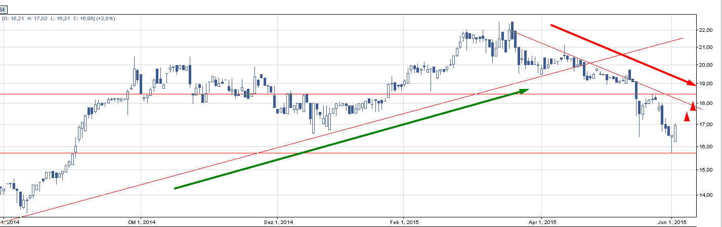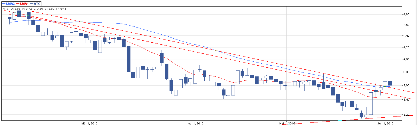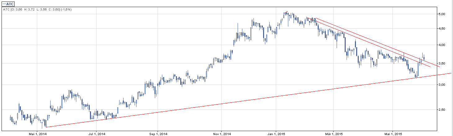 Drugą okazją na którą warto rzucić okiem jest Arctic. Walor nie radzi do końca sobie z trendem, ale na ostatnich sesjach doszło ciekawych wybić, które przykuły moją uwagę. Spójrzmy na średnioterminowy trend oraz na nakładający się na niego krótkoterminowy trend spadkowy: