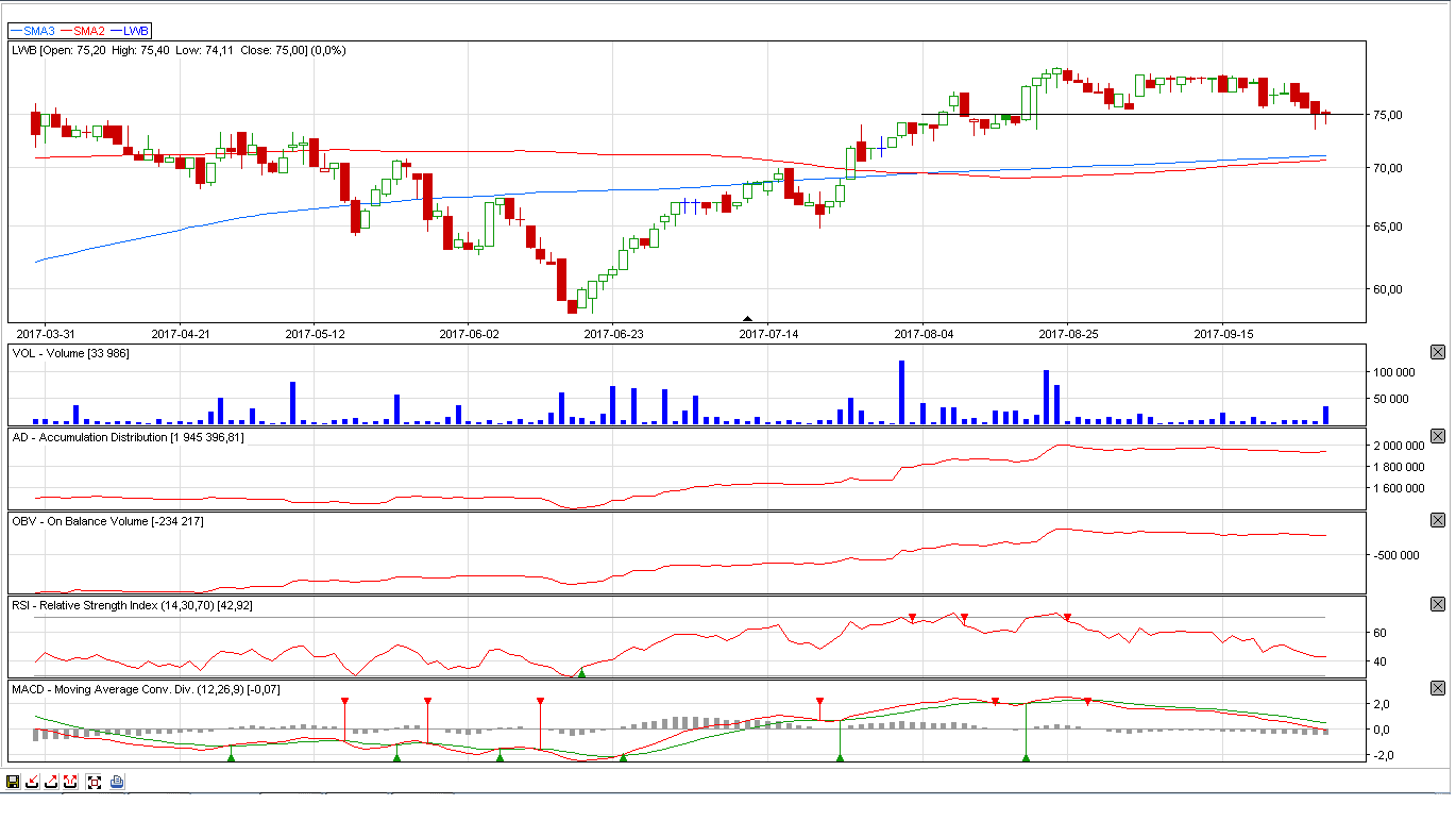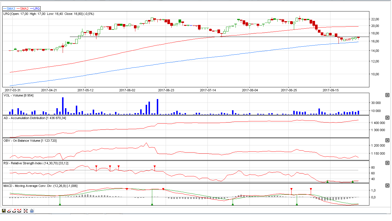 Kurs spółki znajduje się w długoterminowym trendzie wzrostowym. Kurs w trakcie ruchu korekcyjnego dotarł do SMA200, gdzie delikatnie odbił do góry przy tym cały czas trzymając się poniżej oporu na poziomie 17 zł. Kolejnym aspektem są zwiększone obroty mogące świadczyć o akumulacji akcji. MACD jest bliski wygenerowania sygnału kupna.